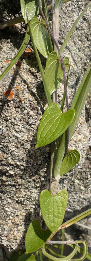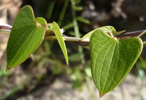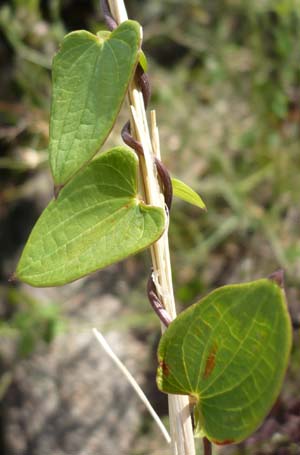 Feuilles adultes de D. heteropoda nain. Petit acumen rouge. Noter l'enroulement dans le sens des aiguilles d'une montre de la tige, rougeâtre et légèrement cannelée |
