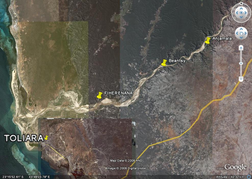 est située au nord de Toliara. L'eau de la rivière alimente la ville de Toliara. La piste qui longe le fleuve à partir de Toliara est coupée au village de Beantsy. Les pirogues sont tabou ("fady") sur le fleuve.