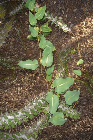 Plantule : vert clair, bords festonnés, nervure principale blanchâtre. Feuilles en verticille. Plante : d’environ 3 à 4 m. Tige : robuste, de couleur orange avec un mucilage collant (observé sur toute la plante) avec de fines auricules. Cataphylle : non notée. Feuilles : vert clair, petites et épaisses en forme de cœur (avec parfois des lobes réduits), bords ondulés. Quantité d’ADN : non déterminée .Inflorescence femelle : environ 20 cm de longueur. Fructification femelle tardive. Inflorescence mâle : environ 10 cm, fleurs espacées de 0,5 cm, grosses fleurs, mucilage collant sur les fleurs mâles. Fruits : verts clairs, environ 2 cm de long. Tubercule : longs (environ 80 cm) à croissance horizontale. La chair est blanche gorgée d’eau avec des fibres apparentes. Période de collecte : tardive. |