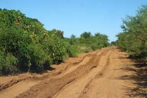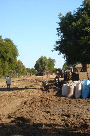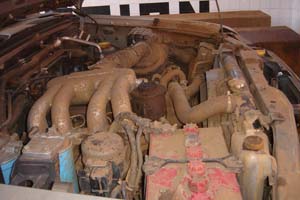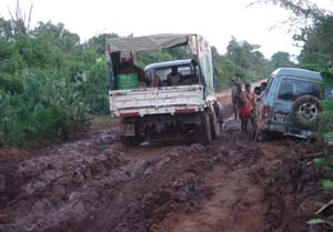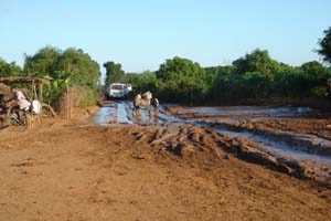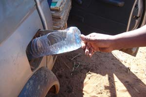 | Dur, dur les traversées de village. Certains attendent l'enlisement pour se trouver un petit boulot | Un entonnoir improvisé (haut). L'état du moteur après une mission (bas) |