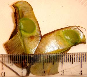Synonyme : vrozy Écologie : sols humifères de sous bois. A partir de 500 m d'altitude. Plantule : non observée. Tige : fine et verte. Nombreuses petites épines à la base. Présence d’éperons auriculaires aux nœuds. Enroulement gauche. Tige souterraine d’environ 50 cm avec des racines aux nœuds. Cataphylle : courte. Feuilles : en forme de cœur avec 3 nervures principales et un acumen effilé d’environ 1 cm. Pétiole assez court. Nervures en relief sur la face inférieure. Quantité d’ADN : non déterminée. Fruits : gros d’environ 3,5 cm de long, peu charnu. Graines arrondies d’environ 0,8 cm avec une aile de taille variable d’environ 1 à 1,5 cm. |